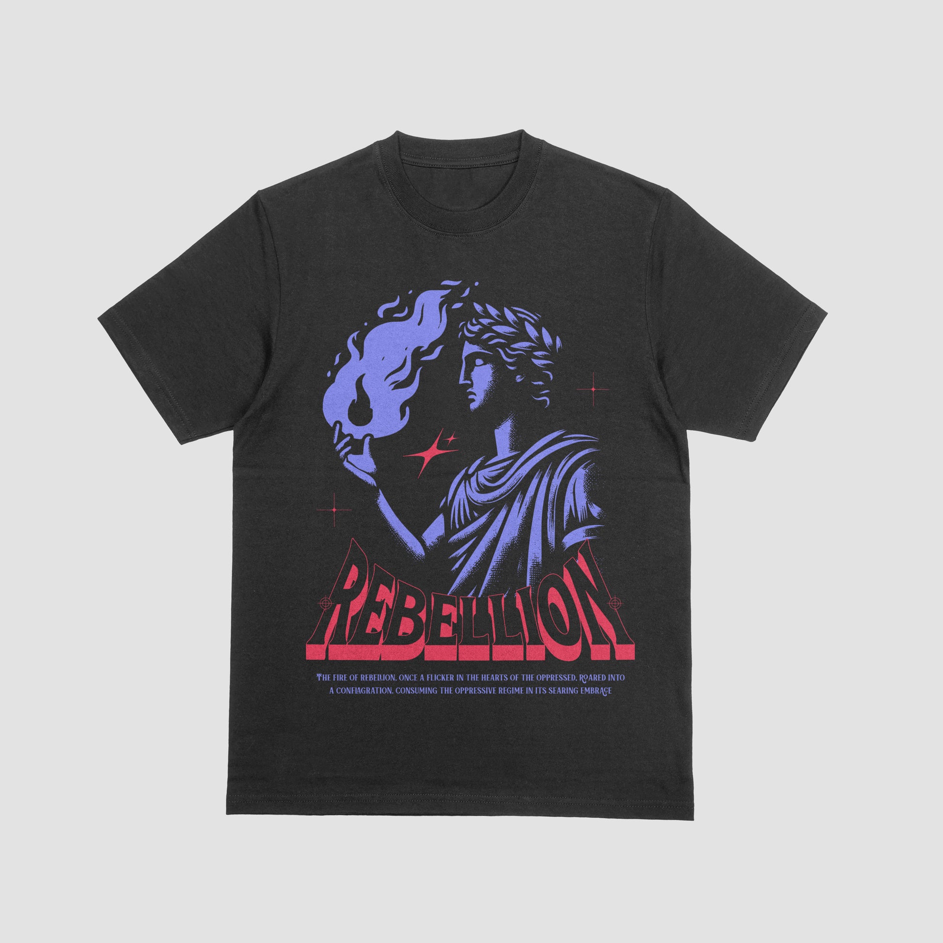 Stir the embers of change in the Rebellion Flame Tee. A classical statue grips a roaring violet-blue flame against a stark black canvas, while bold, three‑dimensional “REBELLION” lettering anchors the design in fiery red. Below, the manifesto reads:
