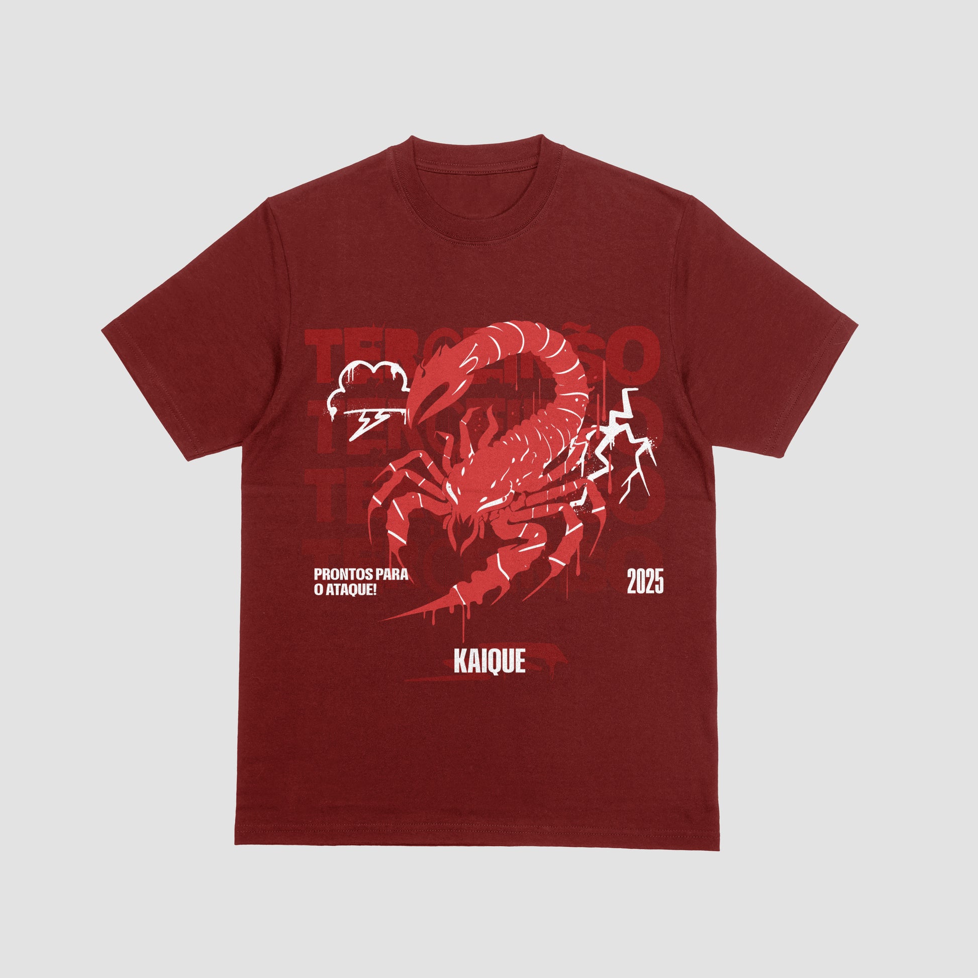 Drenched in danger and ready for action — the Scorpion Strike tee brings the heat. Designed with a fierce crimson scorpion and electrifying lightning bolts, this tee screams intensity. With the Portuguese slogan "Prontos para o Ataque!" (“Ready for the Attack!”) and the name Kaique boldly stamped beneath, this shirt is as personal as it is powerful.