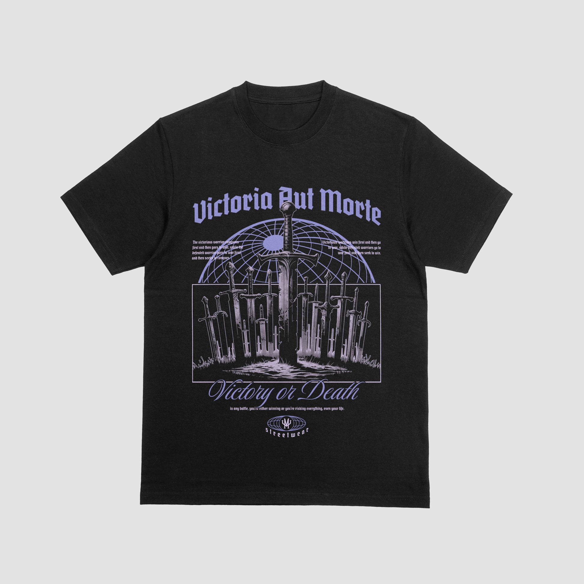 This unapologetic design embodies the ultimate binary: win or perish. “Victoria Aut Morte” (Latin for "Victory or Death") is emblazoned in Gothic purple above a fortress of swords — a symbol of defiance, battle-readiness, and purpose.